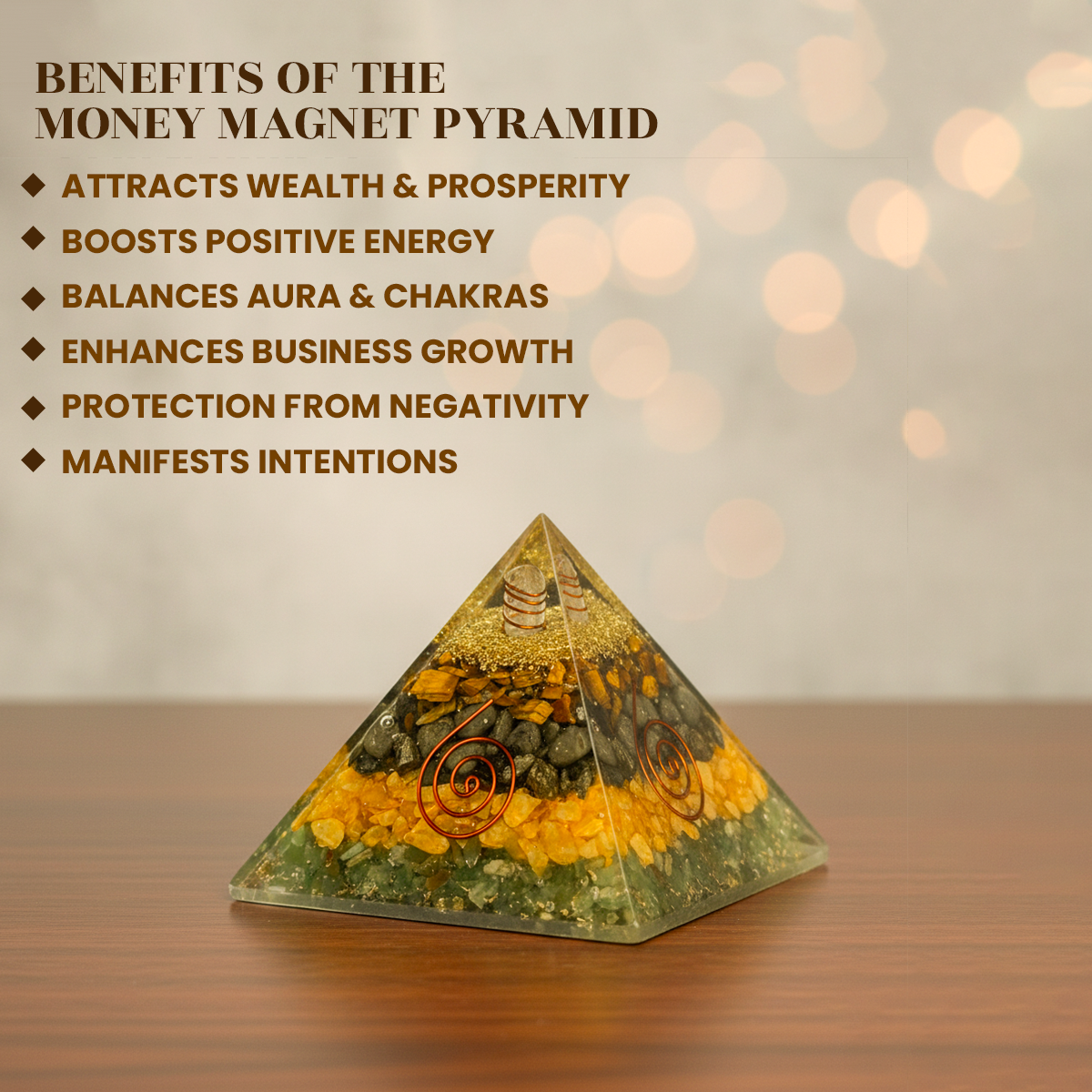 Pyramid shape: Amplifies and directs these powerful prosperity energies.