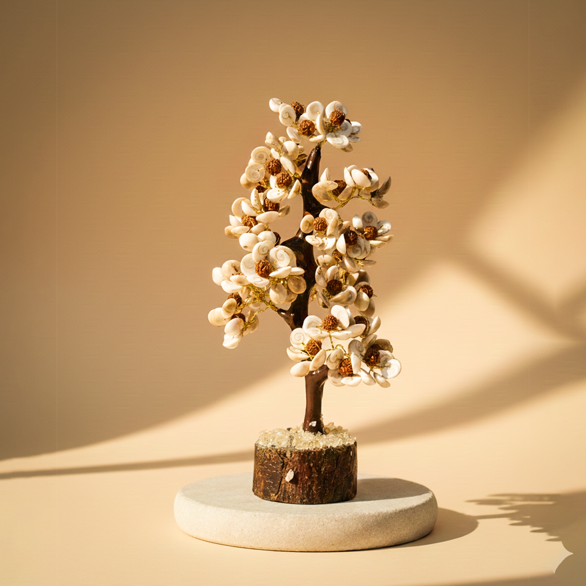This tree features authentic Gomtichakra stones (also known as Gomti Chakra), sacred in Hindu culture, intricately arranged on flexible metallic wire branches. These branches are anchored to a natural crystal or wooden base, symbolizing strength and rooted grounding.
